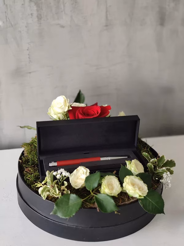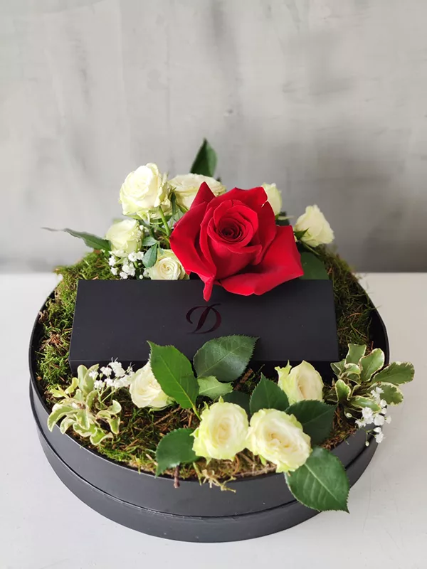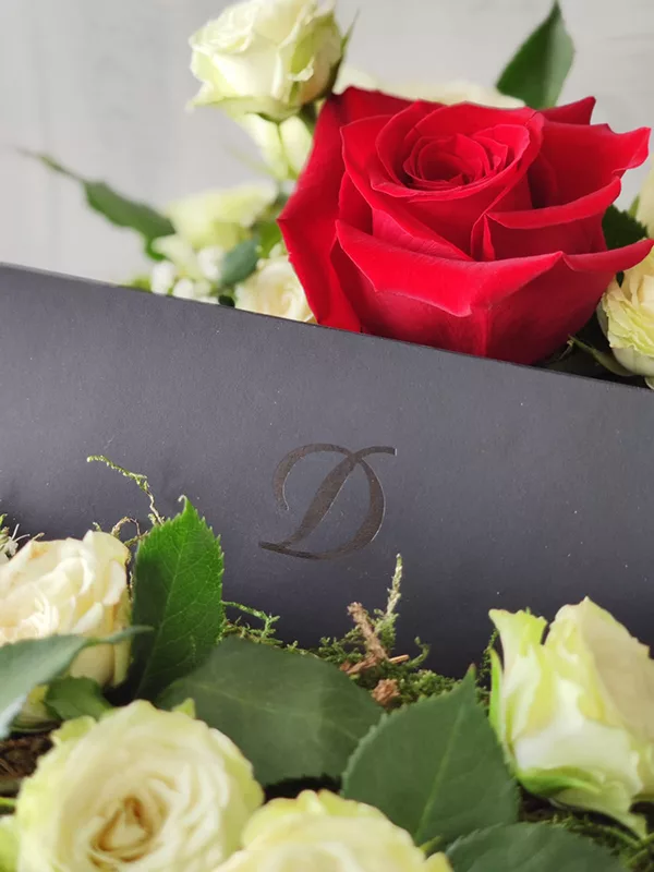 a tray with fresh flowers and a single red rose to highlight a premium gift. The Red Chrome S.T.Dupont pen comes with it’s case wrapped in clear wrapping.