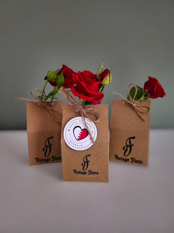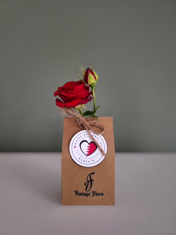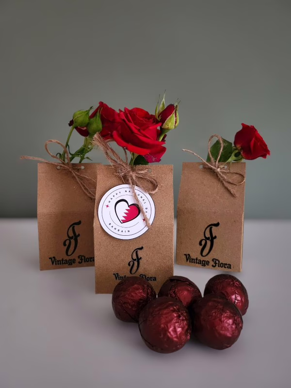 This adorable craft pouch features two chocolates and a tiny baby rose. A perfect patriotic giveaway for Bahrain National Day.