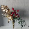 This beautiful 1 foot tall arrangement includes 25 – 30 roses, purple statis and white delphinium.
