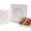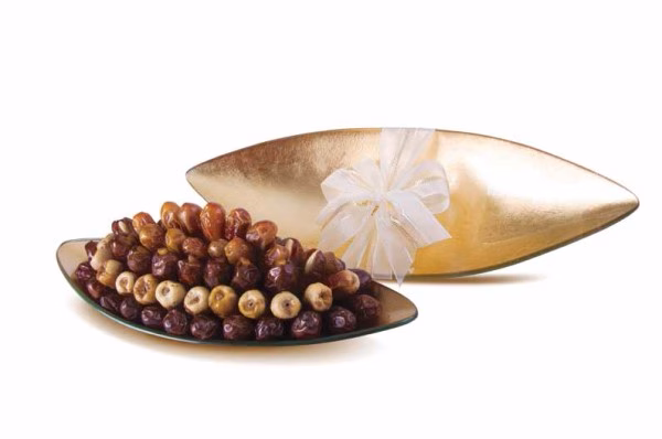 Assorted premium filled Bateel Premium Dates in a Leaf shaped glass tray with a textured golden finish to celebrate the occasion of the holy month of Ramadan.