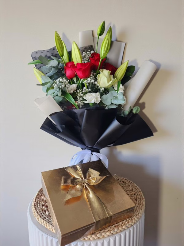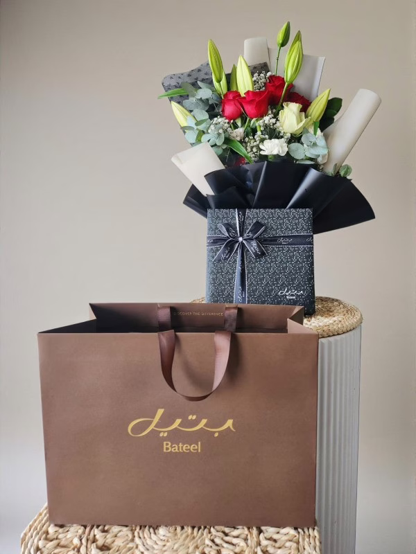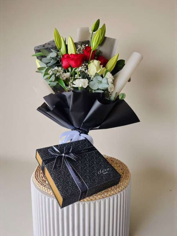 An elegant Ramadan gift featuring a premium Bateel dates gift box paired with a fresh bouquet of red roses and white lilies. A refined expression of generosity and gratitude, perfect for Ramadan gifting, Iftar invitations, corporate gifts, and sharing blessings with loved ones. Available for delivery across Bahrain.