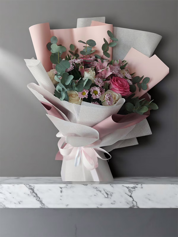 A stunning, sophisticated mix of pink roses and eucalyptus, beautifully wrapped. The perfect gesture of grace and style. Order yours today