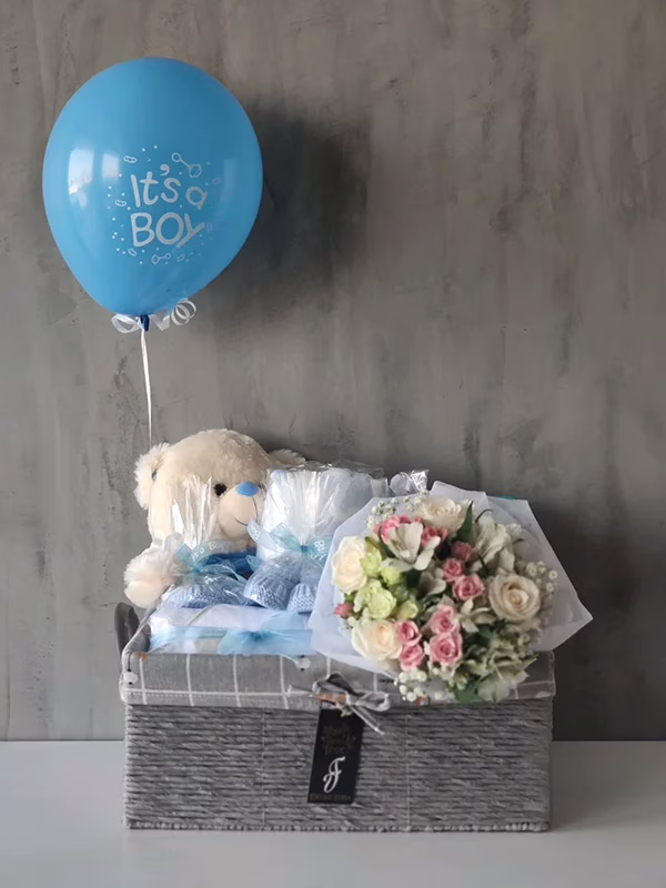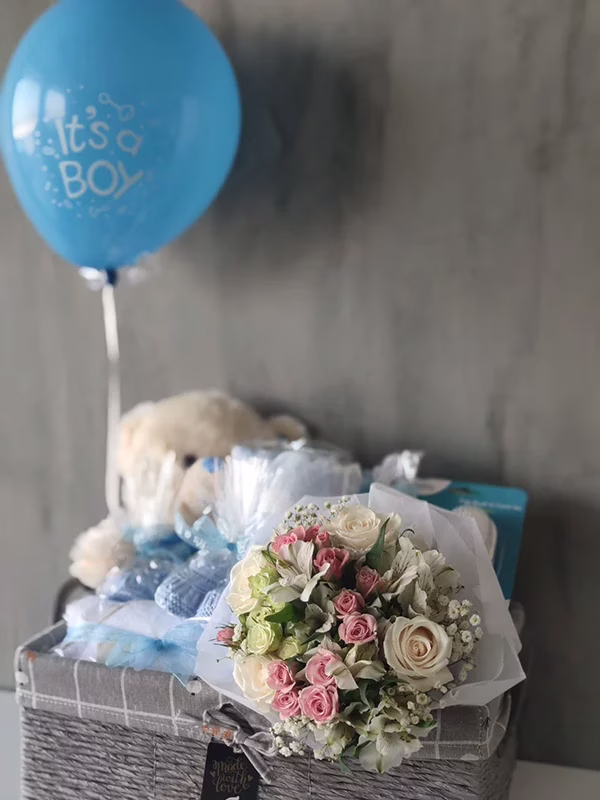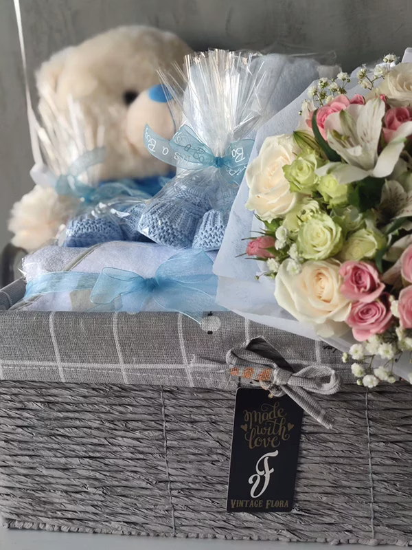 Gorgeous new born baby boy hamper with some fresh flower hand bouquet to the love mom too!
