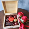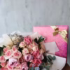 A breathtaking display of lush red and pink roses, chrysanthemums, and fresh greenery, artistically arranged on a wooden canvas. Delivered with its own elegant easel stand, this arrangement makes an unforgettable statement. Personalize it further with your own message on a wooden plaque for a truly one-of-a-kind gift.