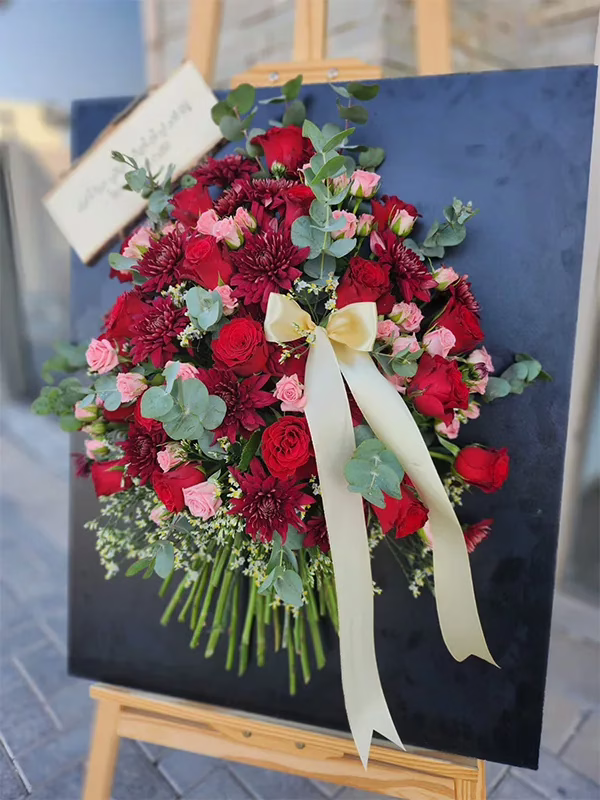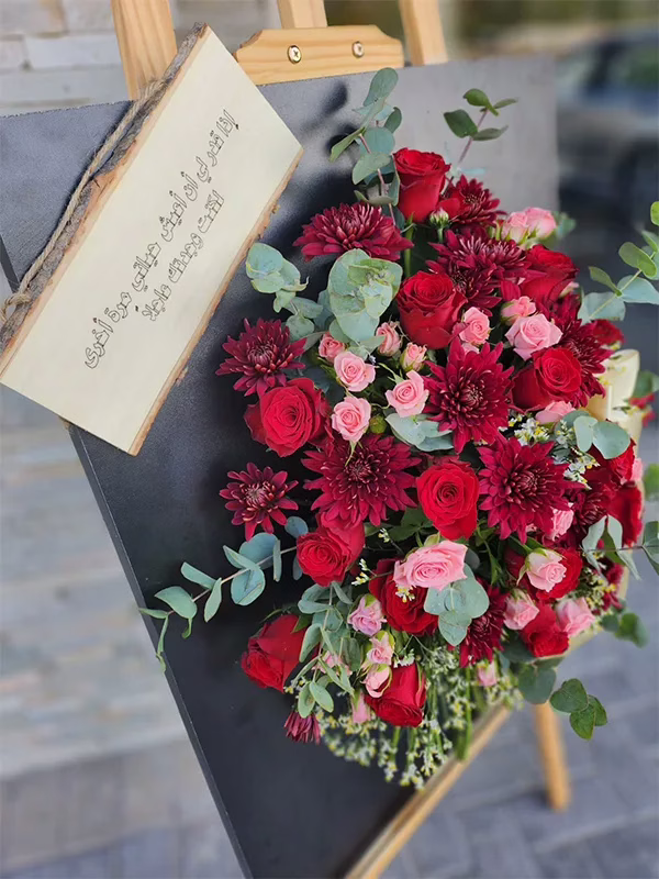 A breathtaking display of lush red and pink roses, chrysanthemums, and fresh greenery, artistically arranged on a wooden canvas. Delivered with its own elegant easel stand, this arrangement makes an unforgettable statement. Personalize it further with your own message on a wooden plaque for a truly one-of-a-kind gift.
