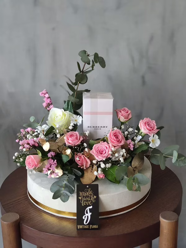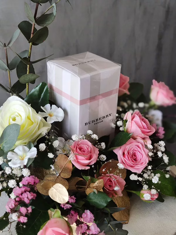 Pastel shade flowers symbolize the kind of affluent and elegant lifestyle that Burberry perfume is known for. This visually appealing velvet gift is ideal for any special occasion.