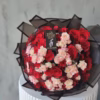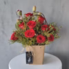 A beautiful bunch of lush red roses arranged in a black box with white orchids nestled in the center. A gold label on the front of the base reads “Beautiful Flowers, For You.” Making extra special for Valentines day.