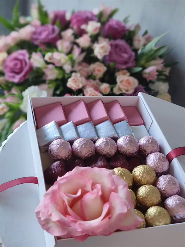 This large box arrangement comes with a variety of colourful blooms and a box of Premium Assorted Belgian Chocolates (300g)