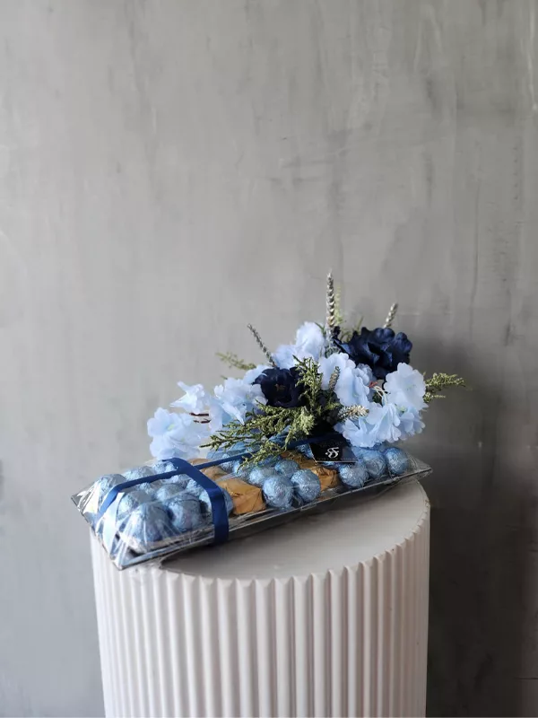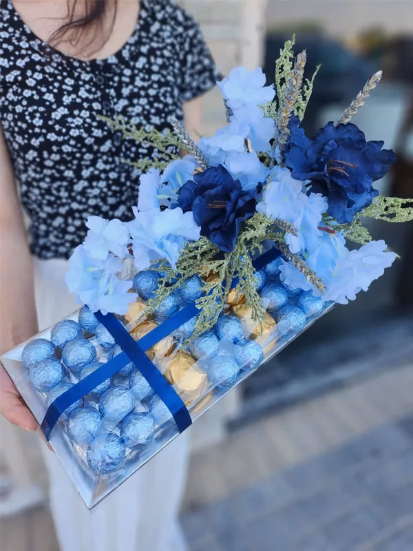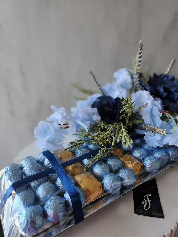 This captures the delightful combination of chocolates and flowers in the bouquet, making it both elegant and tempting. Ideal for new born baby chocolate gifts.