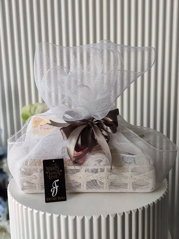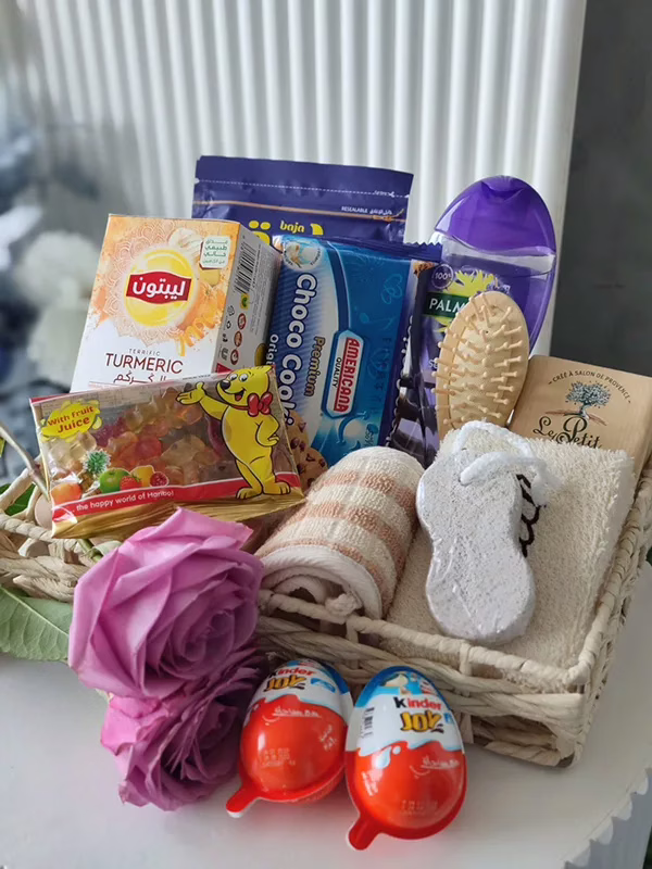 In the image, a wicker basket is stuffed with a variety of things, a bag of gummy bears, a shower gel, chocolate, and a towel. Although the basket is obviously stocked with a range of things,