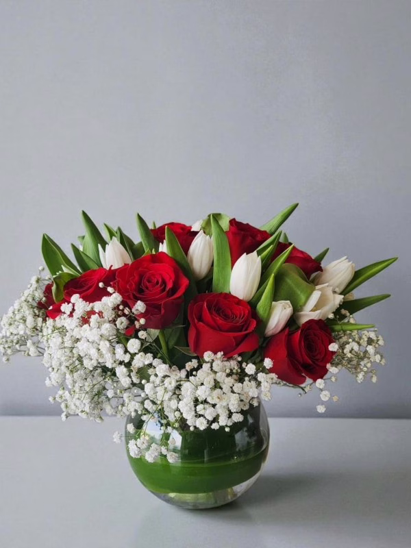Bring the warmth of the holidays into your home with this stunning red and white flower arrangement beautifully styled in a clear fishbowl vase. Perfect as a Christmas centerpiece, office décor, or a thoughtful seasonal gift.
