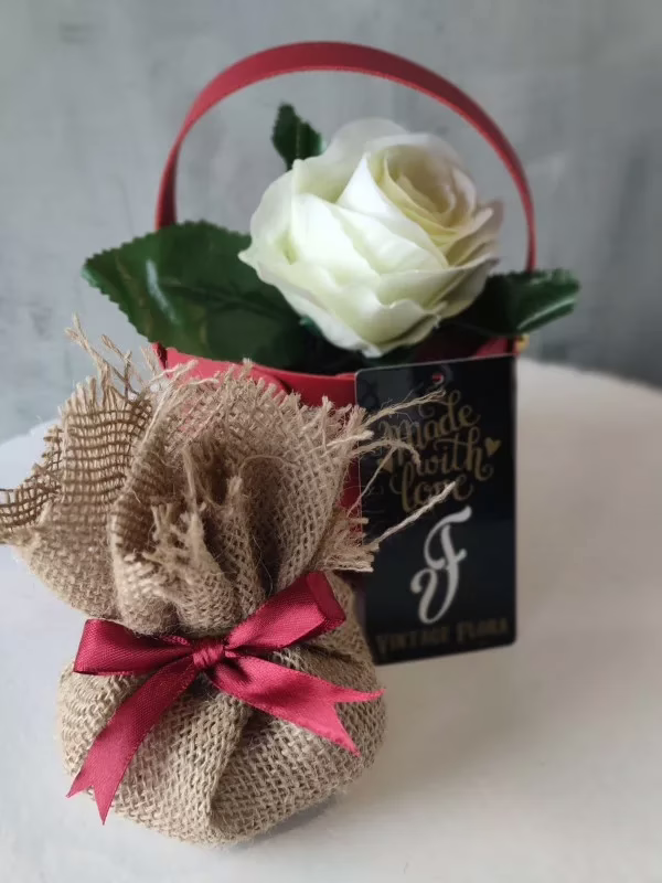 True to its word, this is a cute little chocolate giveaway ideal for the season. A beautiful white rose is nestled in a red leather basket with a handle.