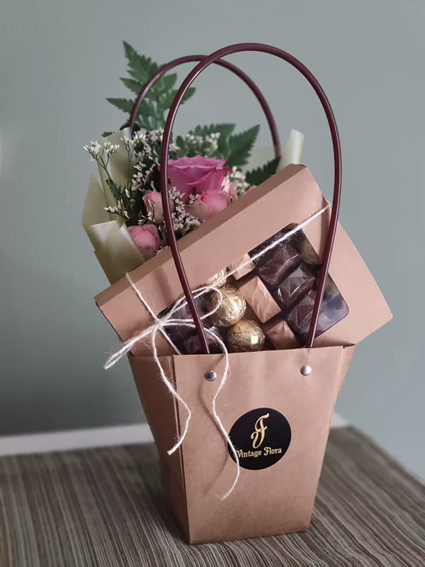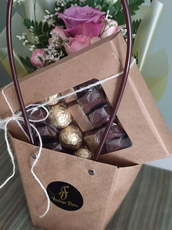 The image depicts a brown paper gift bag with a clear window, revealing an assortment of chocolates inside.