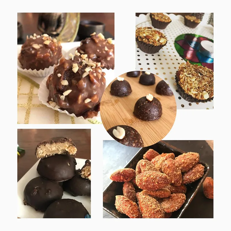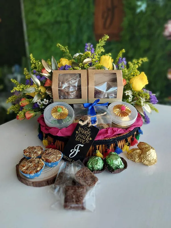 Introducing you to a healthy kinda happiness with this Diwali hamper which contains naturally sweetened, preservative free, home baked goodies. The evergreen stars of all the products are dates and almonds alongside other nuts, seeds or oats. These treats are made without any refined sugars, minimum healthy fats and baked only to order using natural sweeteners like dates, coconut sugar and sometimes honey. Only some products with chocolate coating contain minimal amount of refined sugar. All the items contain nuts or seeds or both and are not suitable for those with nut allergies. The products are also not necessarily gluten free but promise all the sweet pleasure without the guilt.