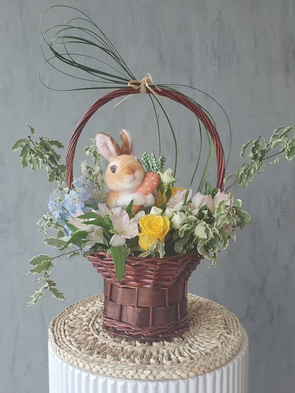 A delightful Easter basket featuring vibrant spring blooms and a cuddly bunny holding a carrot, perfect for spreading cheer and warmth this season.