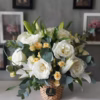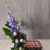 In our attempt to always provide our customers with something new and more than the ordinary, our specialized florist give you this elegant fresh flower arrangement in a solid wood standing base. A selected variety of our luxury chocolates carefully enclosed with a clear glass bell top.