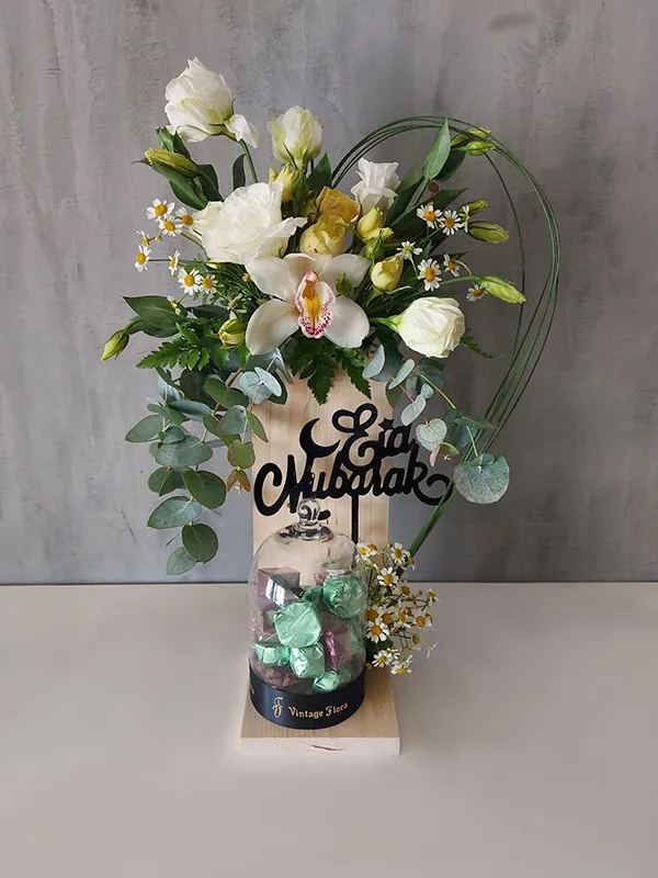 In our attempt to always provide our customers with something new and more than the ordinary, our specialized florist give you this elegant fresh flower arrangement in a solid wood standing base. A selected variety of our luxury chocolates carefully enclosed with a clear glass bell top.