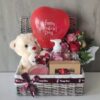 A box with a sweet surprise inside and an I love you helium heart balloon.