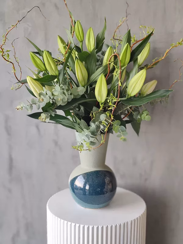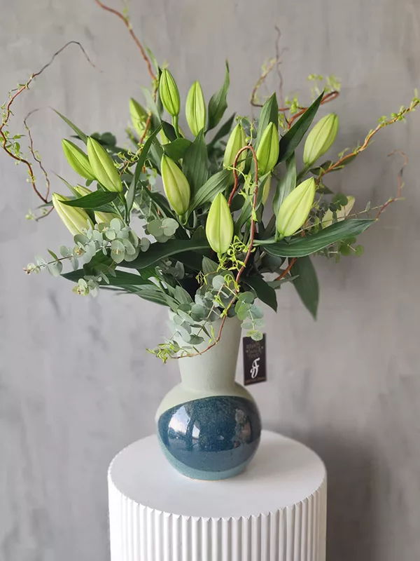 Transform any room with our luxurious large floral arrangement, featuring pristine white lilies that radiate grace and serenity.