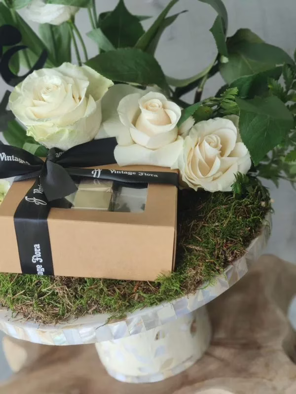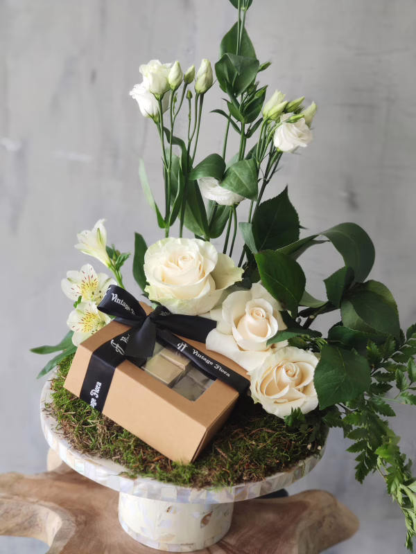Handmade white resin tray comes with a box of mixed chocolates, Fresh flowers and Eid Mubarak acrylic topper.