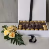 Beautiful craft white magnetic boxes comes with a delightful selection of chocolates and individually wrapped premium dates. To add to the surprise to anyone who receives the gift box, is a little wooden box with assorted nuts and a fresh cut white rose on the side.