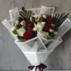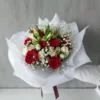 Decorative real wood stand with fresh flowers on top in red and white to mark and celebrate a glorious nation in red and white. Mini flags are attached to individual Belgian Milk Chocolate slabs along with babies breath and red baby roses. Ideal for a national day giveaway gift.