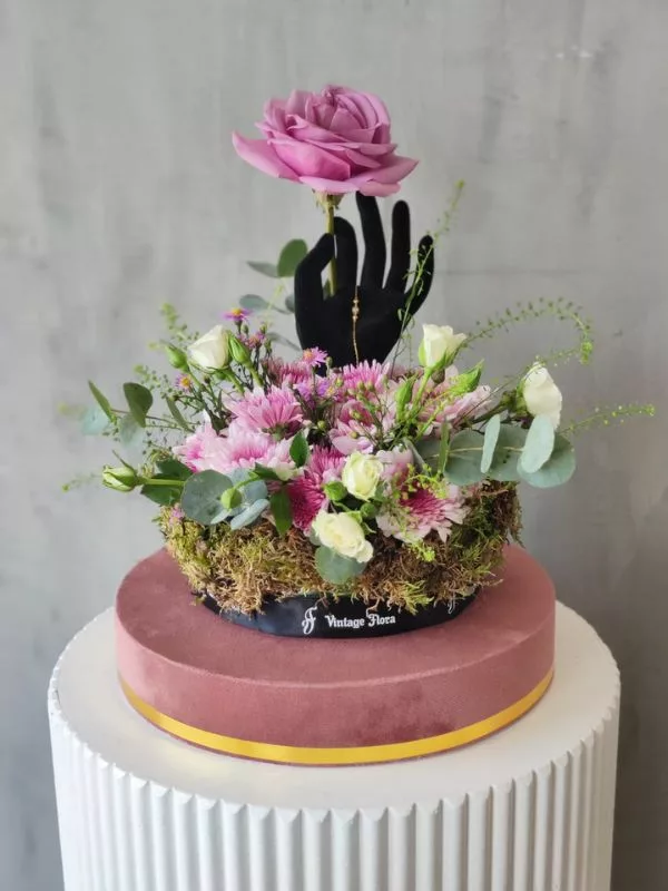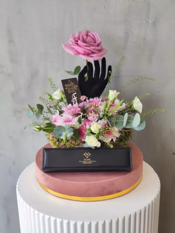 A velvet tray with fresh blooms decorates this gift of a 21-carat gold bracelet, which comes in a box