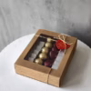 Rectangular cardboard box filled with chocolates that are individually wrapped in golden and red foil. The box has a clear window on top, allowing the chocolates inside to be viewed. It’s tied with a string and has a red heart-shaped tag attached to it, suggesting it could be a gift or for a special occasion. The box is placed on a white round table against a textured grey background. The contrast makes the box of chocolates stand out. It’s a delightful image! 🍫