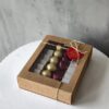 Rectangular cardboard box filled with chocolates that are individually wrapped in golden and red foil. The box has a clear window on top, allowing the chocolates inside to be viewed. It’s tied with a string and has a red heart-shaped tag attached to it, suggesting it could be a gift or for a special occasion. The box is placed on a white round table against a textured grey background. The contrast makes the box of chocolates stand out. It’s a delightful image! 🍫