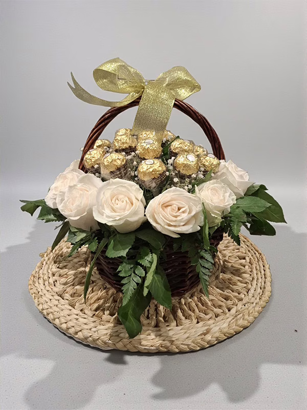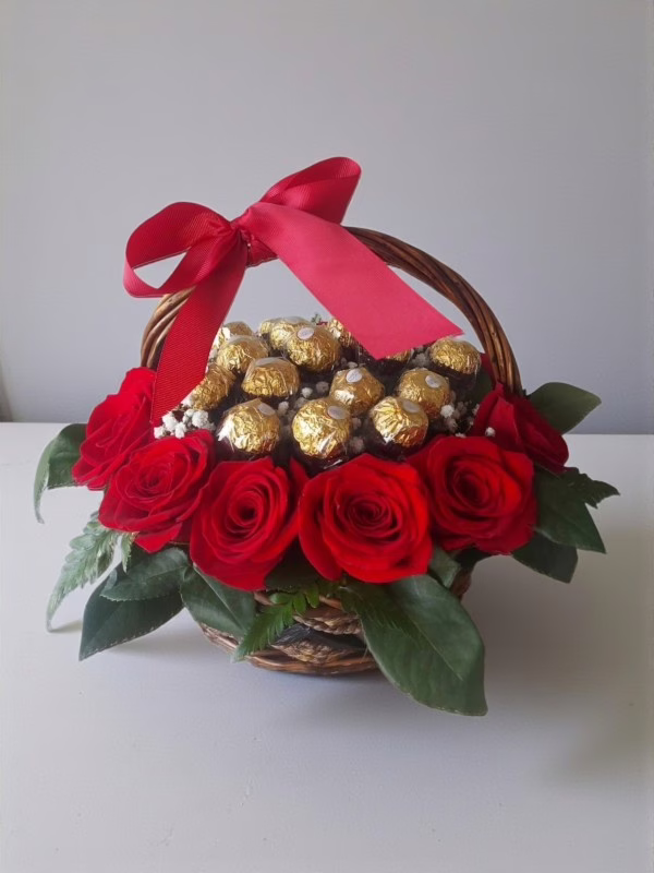 Ideal for any occasion or just because. Gorgeous in every way, a clear expression of your love and affection through Belgian Chocolates and Red Roses. Our bright, lush red roses are embraced in a cloud of white gypso along with Golden treats that imprints a memory of soulful beauty. Our hand-tied bouquet includes 12 stems of Red Roses, 16 Belgian hand designed in a cane basket.