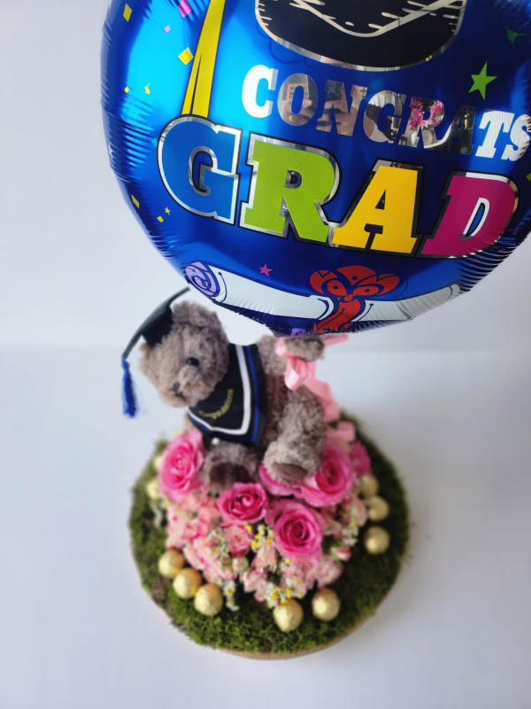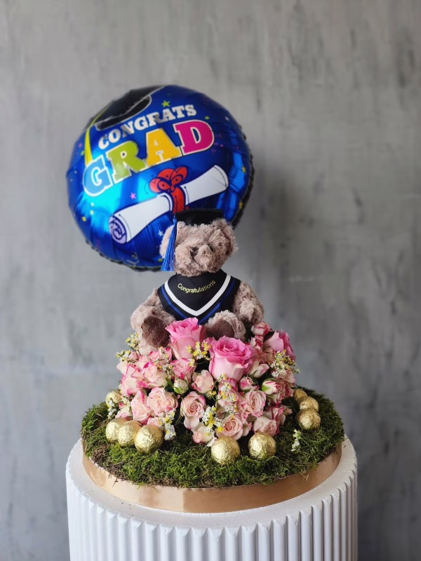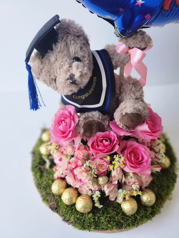 Celebrate their achievement with our stunning graduation arrangement! Featuring a cuddly teddy bear, a vibrant bouquet of fresh flowers, and a festive graduation helium balloon, this gift is perfect for making their big day unforgettable.