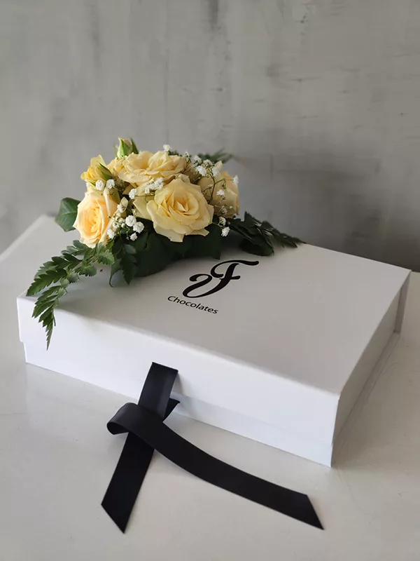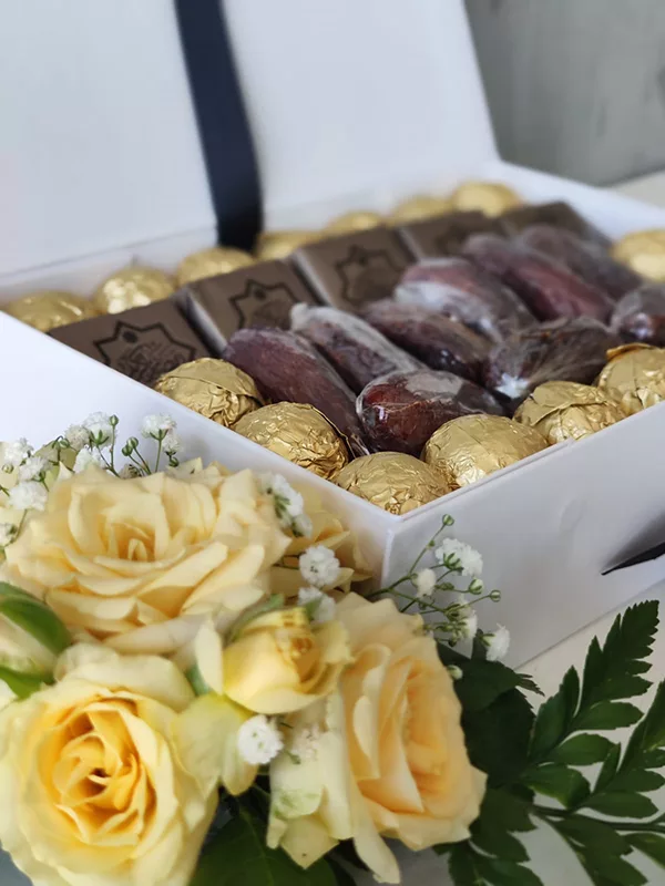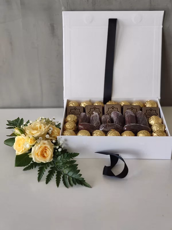 Beautiful craft white magnetic boxes comes with a delightful selection of chocolates and individually wrapped premium dates.