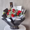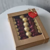 Rectangular cardboard box filled with chocolates that are individually wrapped in golden and red foil. The box has a clear window on top, allowing the chocolates inside to be viewed. It’s tied with a string and has a red heart-shaped tag attached to it, suggesting it could be a gift or for a special occasion. The box is placed on a white round table against a textured grey background. The contrast makes the box of chocolates stand out. It’s a delightful image! 🍫