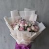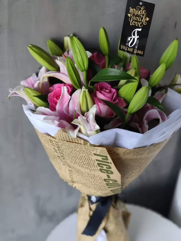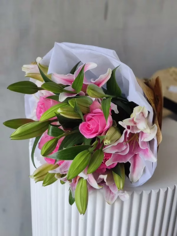 Beautiful bouquet of lilies with roses hand tied in white tissue and paper.
