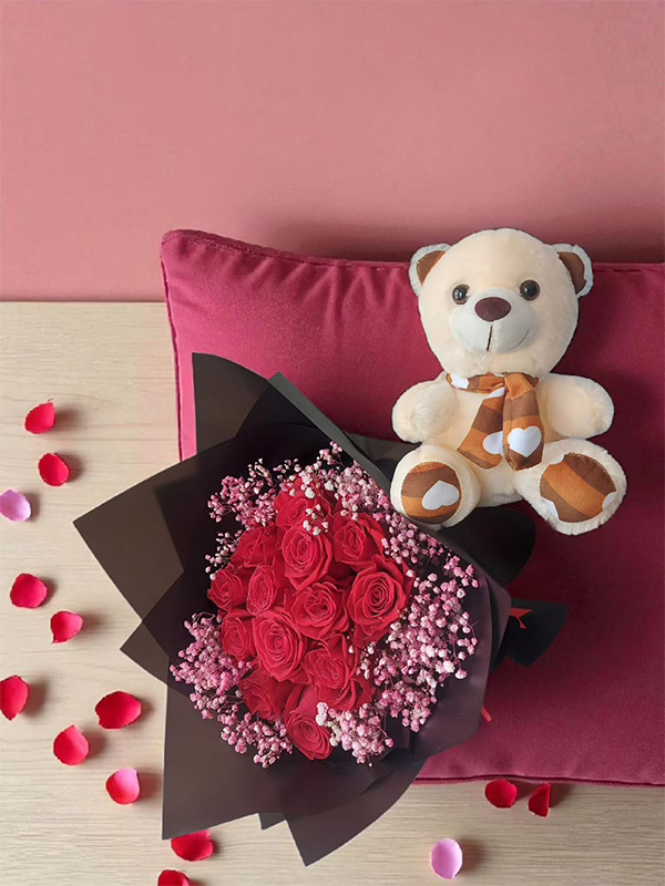 A charming bouquet of fresh red roses paired with a cuddly teddy for the perfect romantic gesture. Teddy included for free!