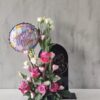 A tray of celebration like no other. A grand gesture with balloons, fruits, chocolates, treats and a special plant and fresh white roses all on a white acrylic tray.