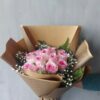 Perfect for any occasion, this elegant hand-tied bouquet is a timeless expression of beauty and affection. Featuring a graceful blend of purple roses, pink blooms, white chrysanthemums, and lush greenery, it’s beautifully wrapped in rustic kraft paper for a touch of charm.