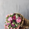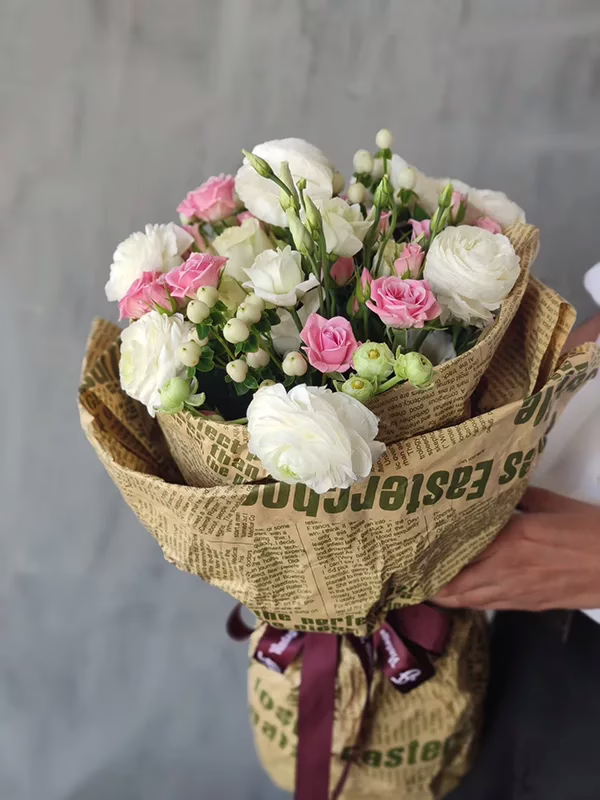 Mix of many blooms of pastel shades with fillers and foliage in a hand tied bouquet wrapped with crushed newspaper.