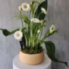 minimalist, matte terracotta vase features a variety of soft pastel flowers, predominantly light peach roses, white gerbera daisies, and delicate cream-colored carnations. The arrangement is accented by green foliage and long, wispy strands of ornamental grass. The unique anthurium leaves add a modern, artistic touch with their subtle pinkish hues. The vase is enhanced with a textured ribbon wrapped around its middle, complementing the natural, earthy aesthetic look.