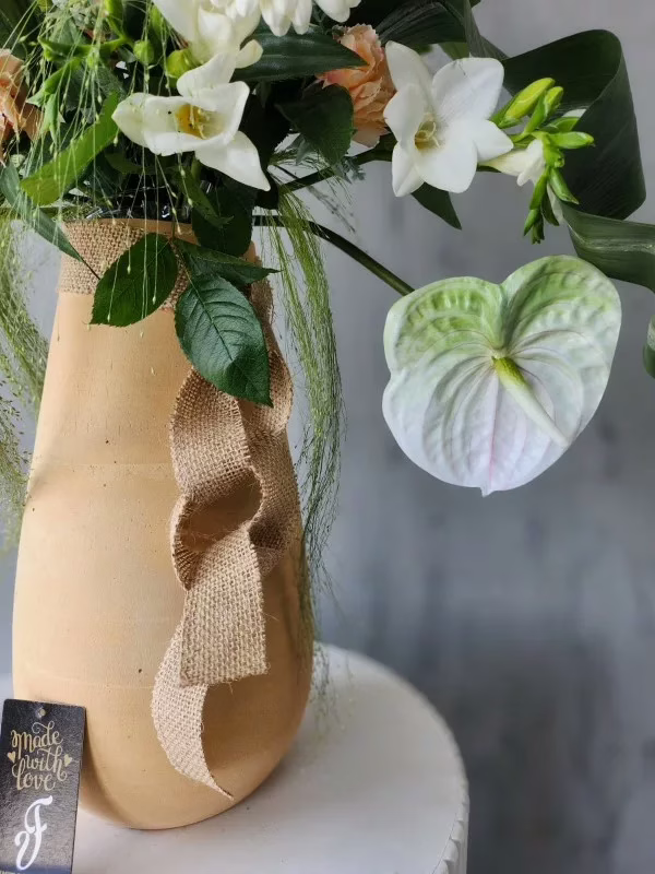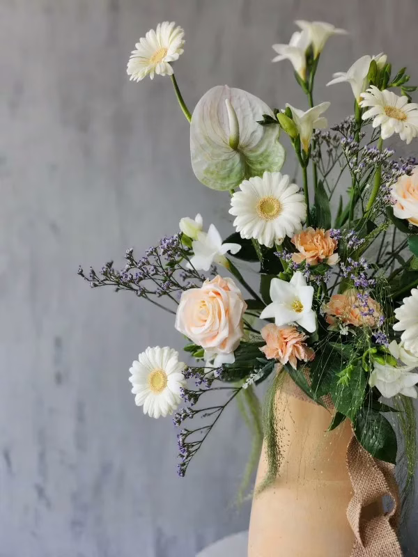 minimalist, matte terracotta vase features a variety of soft pastel flowers, predominantly light peach roses, white gerbera daisies, and delicate cream-colored carnations. The arrangement is accented by green foliage and long, wispy strands of ornamental grass. The unique anthurium leaves add a modern, artistic touch with their subtle pinkish hues. The vase is enhanced with a textured ribbon wrapped around its middle, complementing the natural, earthy aesthetic look.