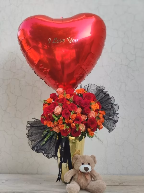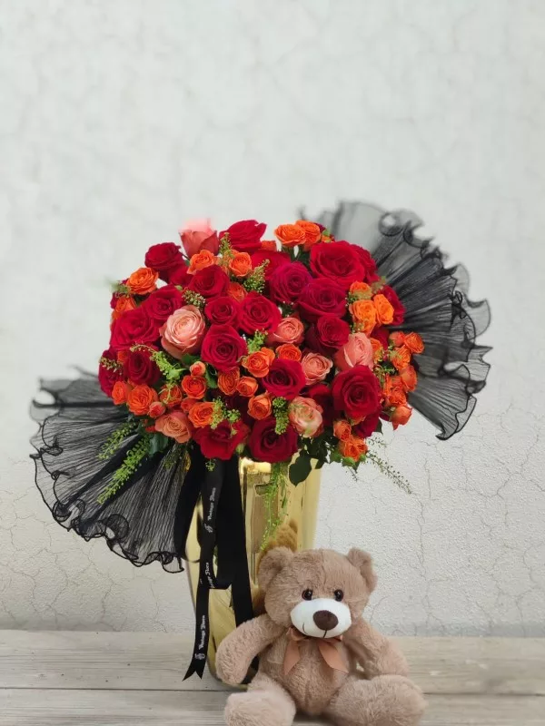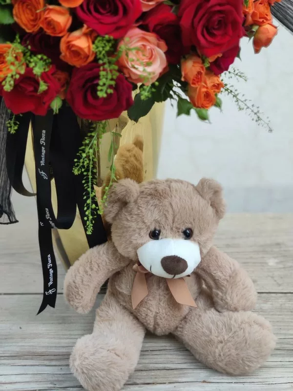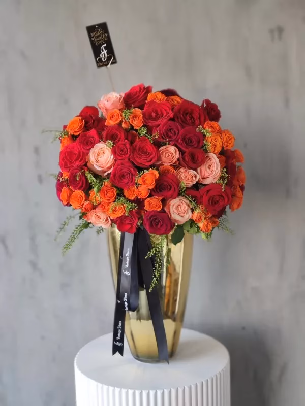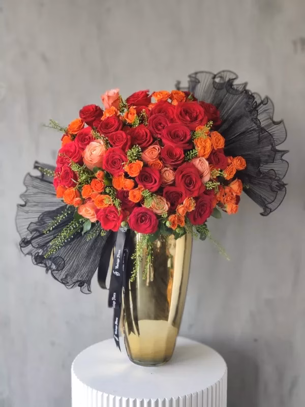 The roses are in full bloom, and velvety red. The golden vase is a simple and elegant yet adds a touch of sophistication and complements the flowers perfectly.