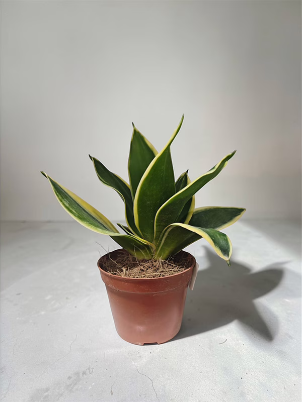 A compact and stylish Mini Snake Plant featuring vibrant green leaves with soft yellow edges, set in a clean white pot. Perfect for desks or small spaces, this low-maintenance plant adds a fresh, modern touch to any room.