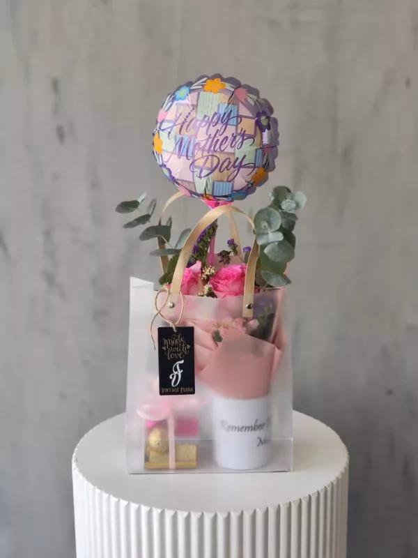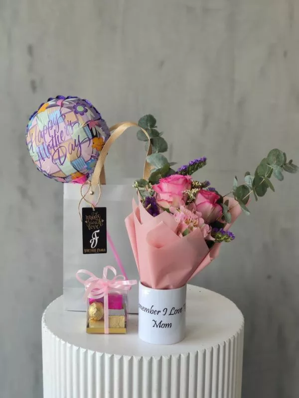 A vibrant bouquet with pink roses and eucalyptus leaves is presented in a cute handy bag. Mini stick foil balloon and a mug that says “Remember I love you mom” completes the gift set.