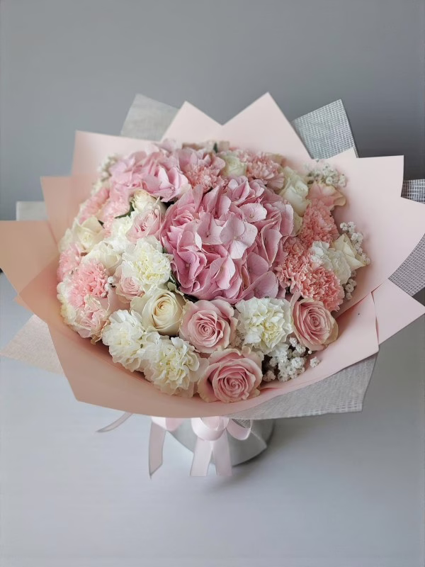 A delicate mix of light pink hydrangeas, carnations, and roses, beautifully arranged in soft pastel shades of pink and white. This elegant bouquet exudes charm and grace perfect for birthdays, anniversaries, or simply to brighten someone’s day.