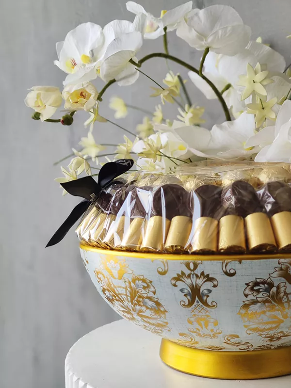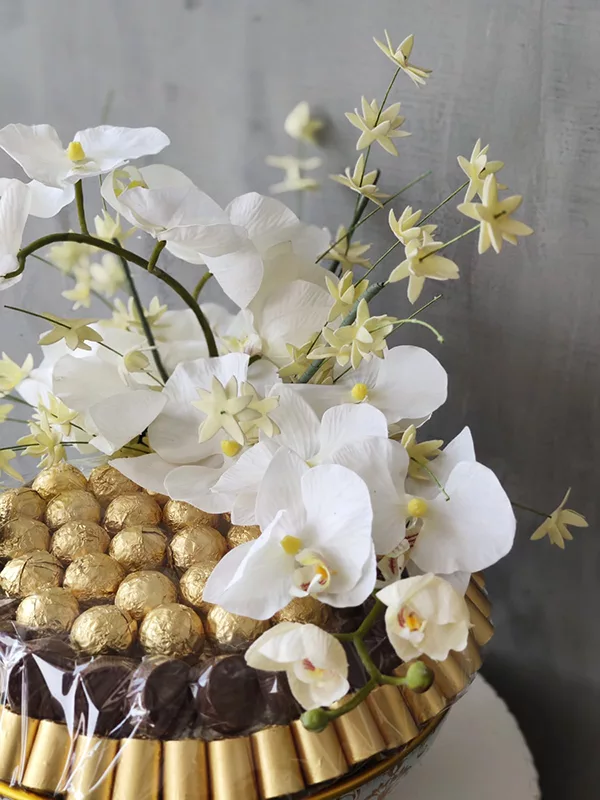 This is a stunning centerpiece that combines the richness of premium chocolates with the timeless beauty of white orchid flower arrangement.