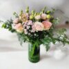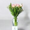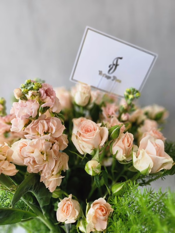 A luxurious arrangement of peach roses and peach mathiola blooms in a premium glass vase, radiating elegance and charm.