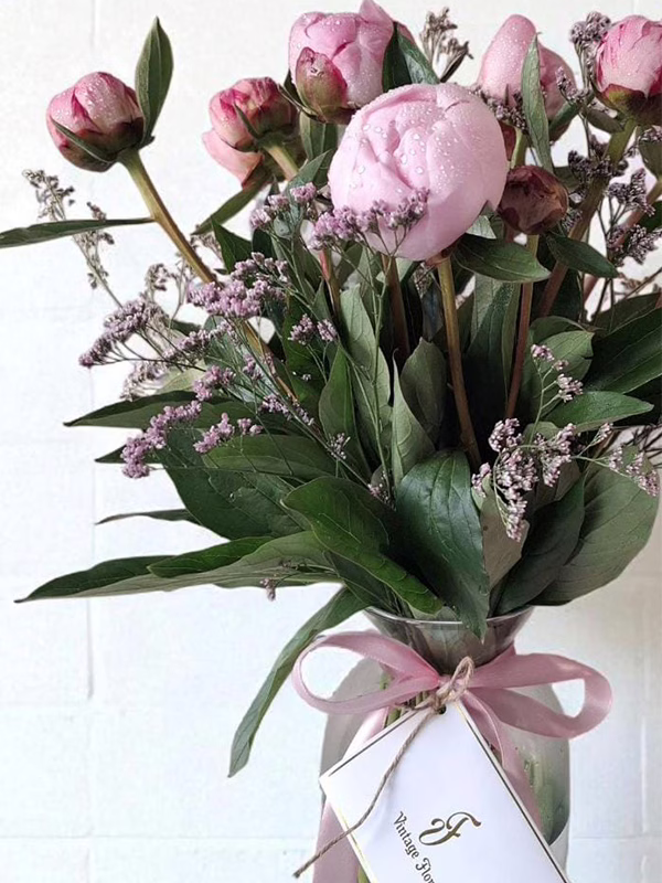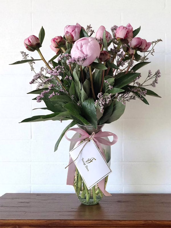 Elegant pink peonies arranged in a clear glass vase. A timeless gift of grace and charm, perfect for any occasion.