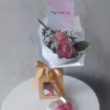 Elegant velvet base comes with a beautiful arrangement of fresh white blossoms and a single pink rose. Mini fabric pouches with a “think pink” ribbon holds a single baby glitter pink wrapped confetti chocolate. (Includes nuts)