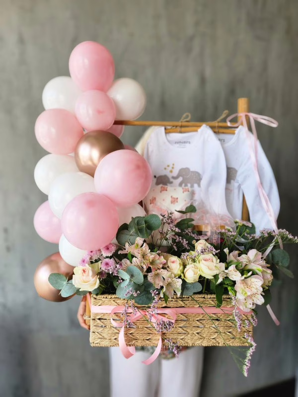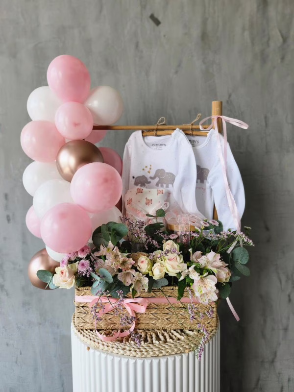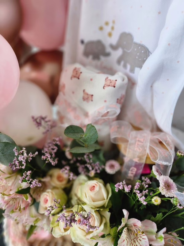 Celebrate the arrival of a little one with our charming Baby Hamper! Accentuated with elegant pastel flowers and lush foliage, it’s the perfect gift to welcome precious new beginnings.