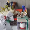 Belgian milk chocolates in red and white arranged to represent the glorious Bahrain flag and a cute flower well in the side. All arranged in a clear black wooden tray